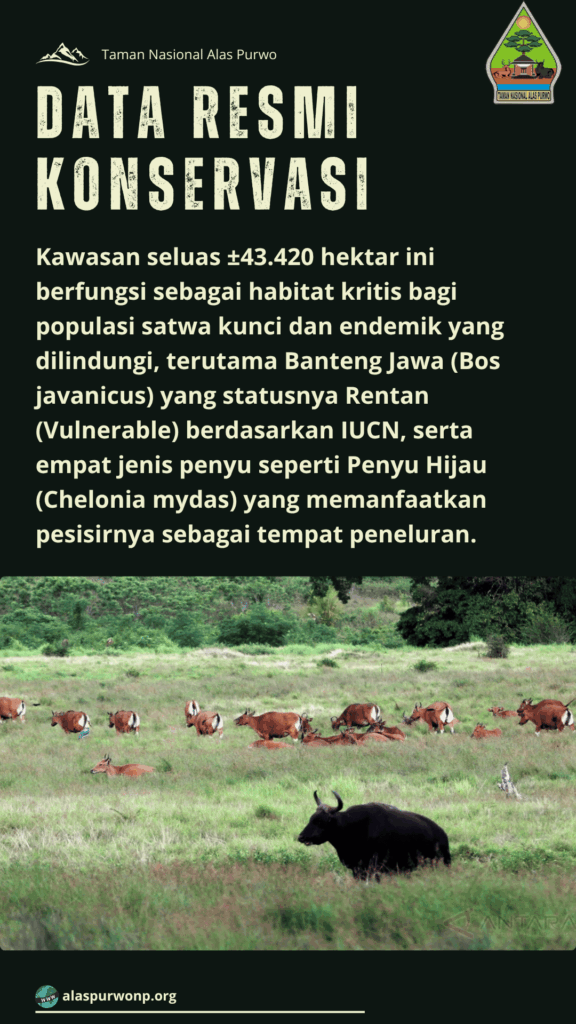 Taman Nasional Alas Purwo yang terletak di Kabupaten Banyuwangi, Jawa Timur, memegang peran strategis dan multidimensi dalam sistem kawasan konservasi Indonesia, tidak hanya sebagai benteng terakhir bagi pelestarian keanekaragaman hayati Pulau Jawa, tetapi juga sebagai laboratorium alam dan model pengelolaan konservasi terpadu. Sebagai salah satu taman nasional yang merepresentasikan ekosistem hutan halaman tropis dataran rendah yang semakin langka, kawasan seluas ±43.420 hektar ini berfungsi sebagai habitat kritis bagi populasi satwa kunci dan endemik yang dilindungi, terutama Banteng Jawa (Bos javanicus) yang statusnya Rentan (Vulnerable) berdasarkan IUCN, serta empat jenis penyu seperti Penyu Hijau (Chelonia mydas) yang memanfaatkan pesisirnya sebagai tempat peneluran. Lebih dari sekadar perlindungan spesies, Taman Nasional Alas Purwo menjalankan fungsi ekologis vital sebagai daerah tangkapan air (catchment area) yang mendukung sistem hidrologi di wilayah ujung tenggara Jawa. Secara paralel, melalui skema Kemitraan Konservasi dan pengembangan ekowisata berkelanjutan—seperti wisata alam Sadengan, wisata bahari Plengkung (G-Land), dan edukasi konservasi penyu di Pantai Ngagelan—TN Alas Purwo membuktikan bahwa praktik konservasi dapat berjalan sinergis dengan pemberdayaan ekonomi masyarakat lokal dan menjadi pusat pendidikan lingkungan hidup, sehingga secara utuh merefleksikan komitmen Indonesia dalam mencapai target-target global Konvensi Keanekaragaman Hayati (CBD).